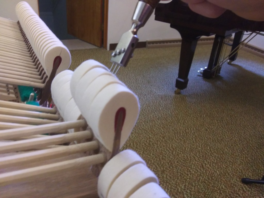 As the piano is played the hammer felt gets worn from striking the strings over and over again. These grooves can cause uneven and harsh tone. The hammers can be sanded back into a nice round and smooth shape, improving the tone.