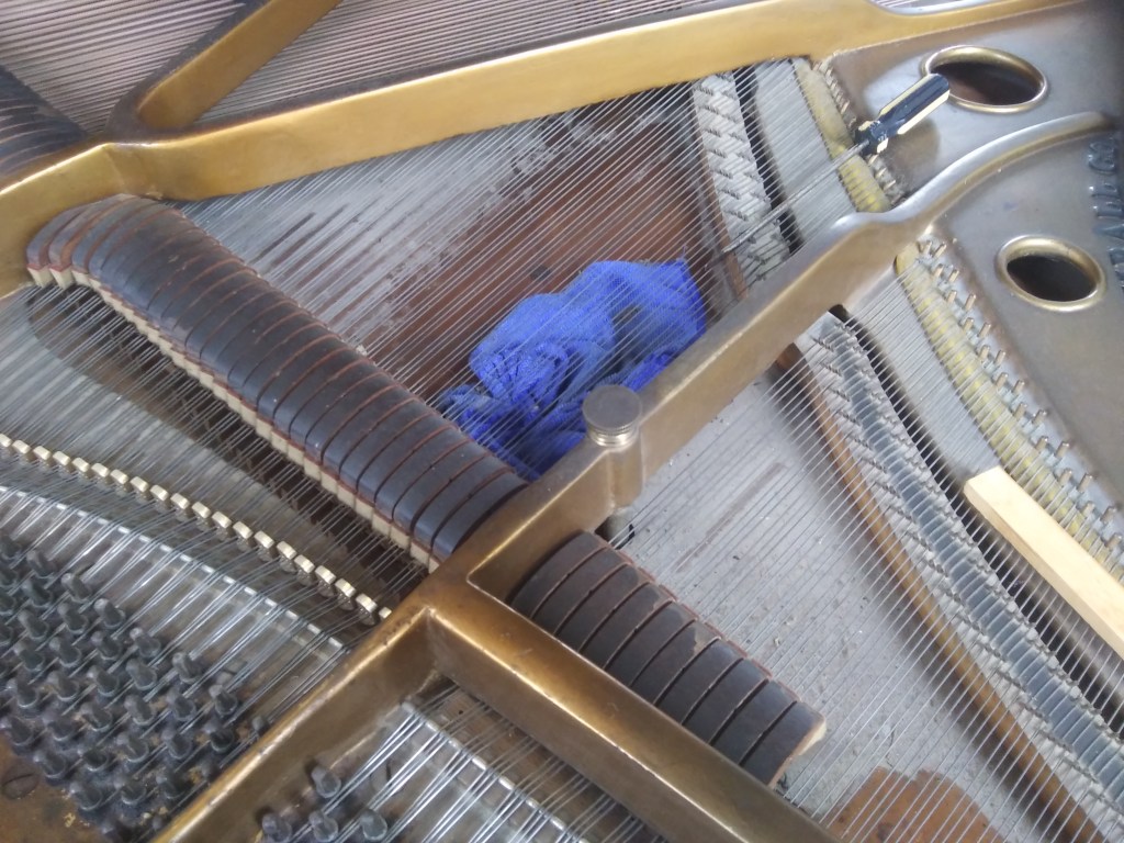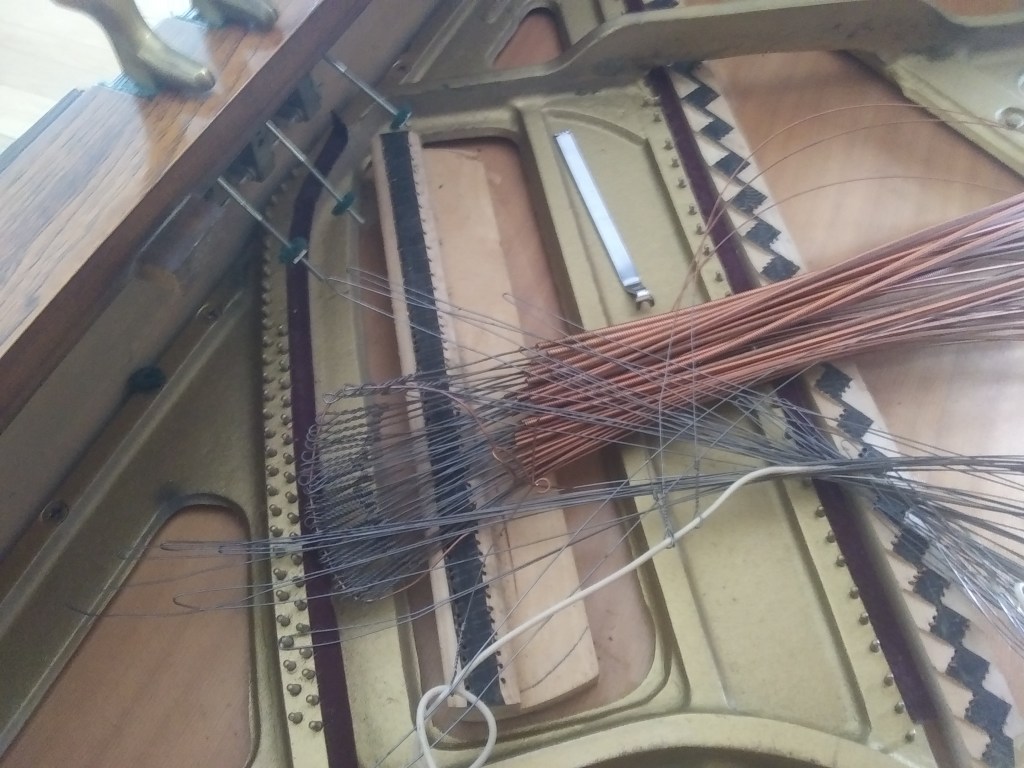 Or pictured here is a piano on which I removed almost all the strings to repair a splitting bridge.